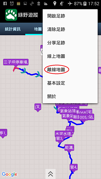 如圖,點一下「顯示」的地方,就會如地圖上粉紅色的軌跡一般,show出先前網友上傳分享的GPX航跡。