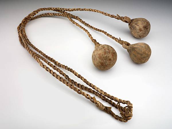 這是繩球的一種延伸應用,也是用來捕捉獵物。值得一提的是,除了飛擲造成的傷害之外,這種繩球也可以應用在追捕比較大型的動物。它可以通過糾纏、絆倒大型獵物的腳,來方便大家使用其他的矛、標槍、或者其他獵具來達到捕捉或殺害的目的。